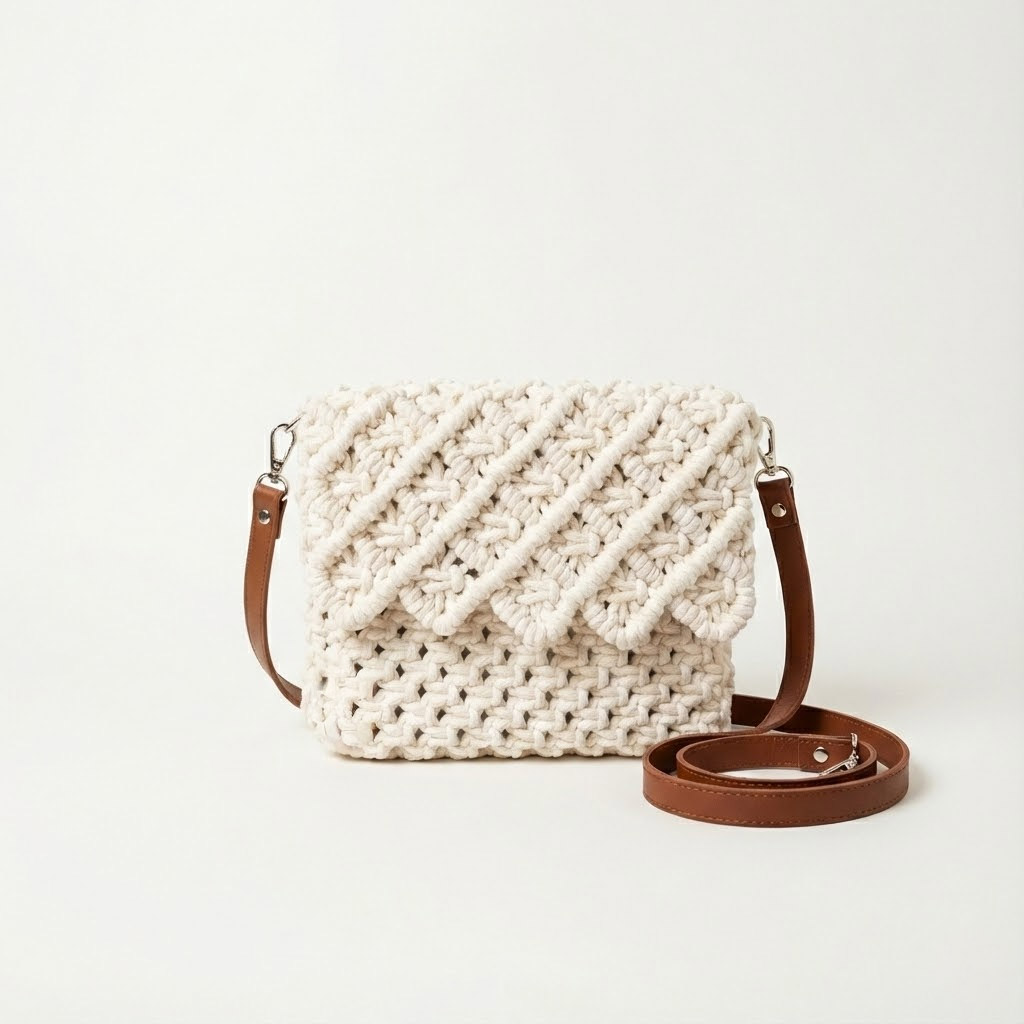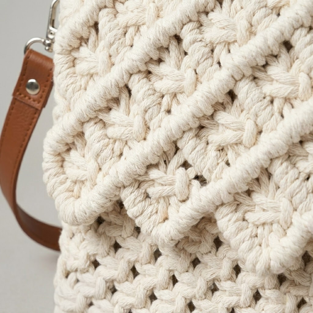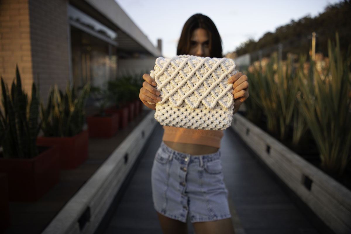 Quando o nó se torna joia. Sob as luzes da noite, a complexidade do macramê da Bolsa Lolita se revela em texturas esculturais. Uma peça compacta, mas de impacto gigante, feita para acompanhar jantares, casamentos e eventos onde o detalhe é o protagonista.